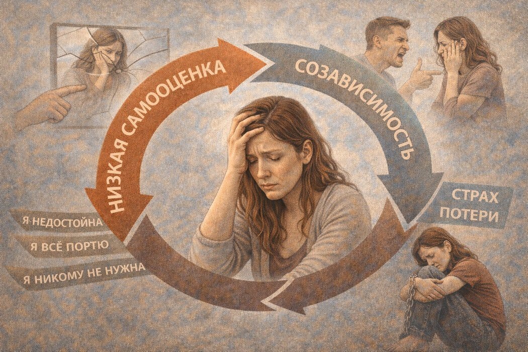 Созависимость и низкая самооценка редко существуют отдельно друг от друга. Чаще всего это единая система, в которой одно состояние усиливает другое. Если человек с детства усвоил, что любовь нужно заслуживать, что его ценность зависит от пользы для других, формируется нестабильное ощущение собственной значимости. Во взрослом возрасте это проявляется в болезненной потребности быть нужным, страхе отвержения и постоянном сравнении себя с окружающими. Низкая самооценка становится внутренним фоном, а созависимые отношения — способом временно почувствовать свою важность. Однако это ощущение держится недолго и требует всё новых подтверждений извне. Так возникает замкнутый круг, из которого сложно выйти без осознанной внутренней работы. Человек с устойчивым самоуважением способен строить партнёрство на основе равенства. При низкой самооценке появляется скрытое убеждение: «со мной что-то не так», «меня могут не выбрать». Это усиливает тревожность и готовность терпеть неудобства ради сохранения