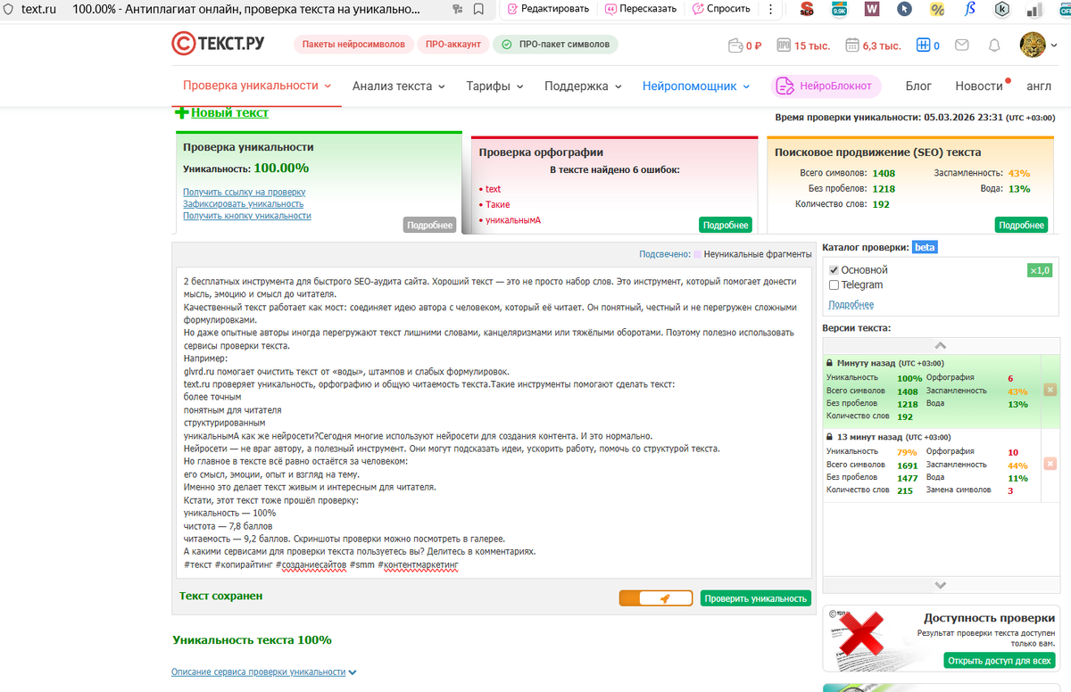 его смысл, эмоции, опыт и взгляд на тему. Именно это делает текст живым и интересным для читателя. 📊 Кстати, этот текст тоже прошёл проверку: Скриншоты проверки можно посмотреть в галерее. 💬 А какими сервисами для проверки текста пользуетесь вы? Делитесь в комме