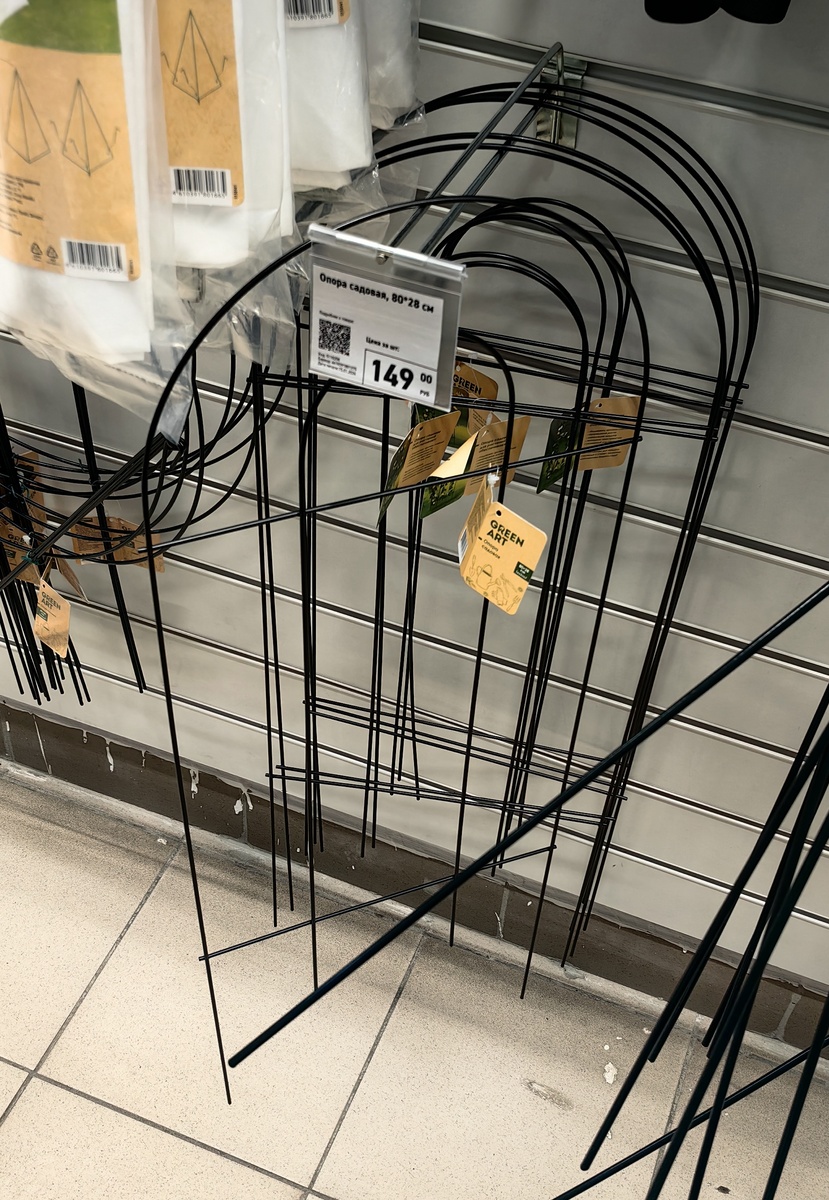 Опоры с круглящами тоже годные. Можно было бы даже и такую взять для огурца, но что-то мне лучше представилась черная хлипкая в этой роли))) Тут же в кадр грабли попали веерные, что-то я их первый раз увидела.