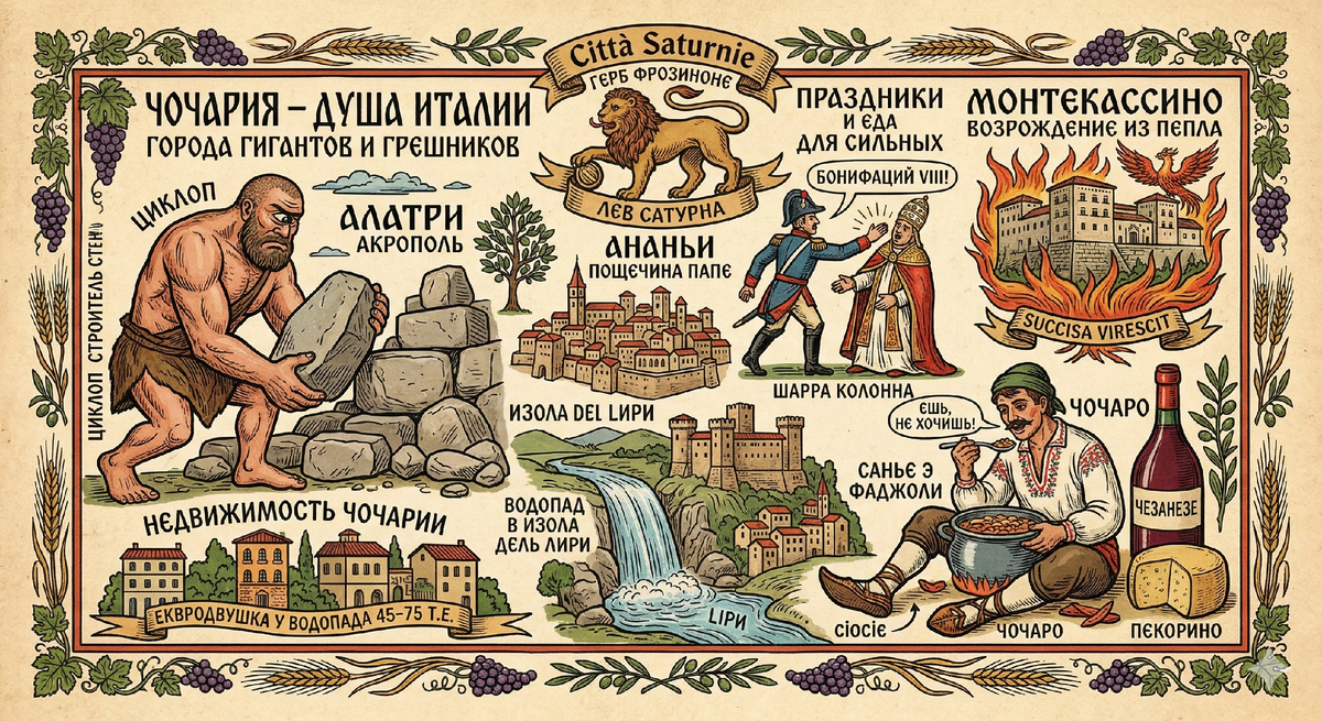 Провинция Фрозиноне — это Чочария. Название происходит от «ciocie» — традиционных кожаных лаптей с загнутыми носами и длинными ремешками, которые веками носили местные пастухи, перевязывая ими голени поверх суконных обмоток. Это край контрастов: здесь стоят самые неприступные и богатые аббатства Европы, и здесь же кипели самые яростные восстания бедноты и бригантизма. Чочария — это душа Италии без фильтров, место, где святость и грех пьют из одного колодца, а эхо шагов в пустых переулках звучит как молитва на латыни.