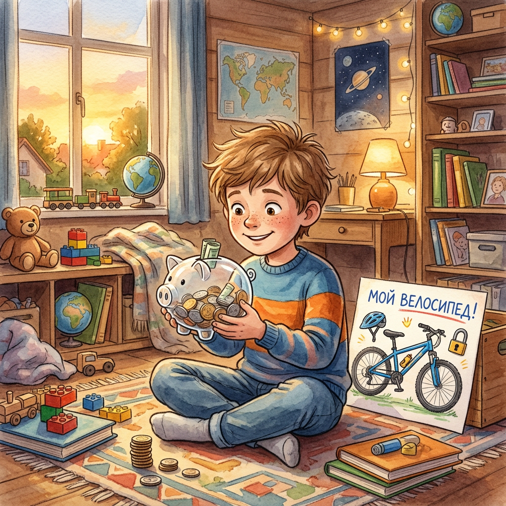 В этом возрасте можно ставить финансовые цели: «Если будешь откладывать половину карманных денег, через месяц сможешь купить ту самую игрушку». Копилка — лучший друг.