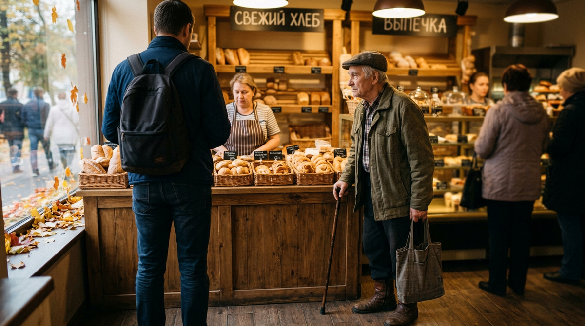 Потому что очередь. Потому что хлеб. Потому что человек с теми же плечами повернул голову.