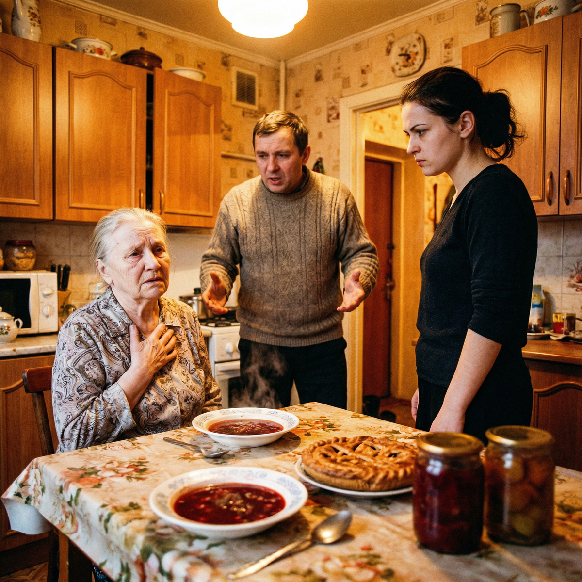 На кухне стол был накрыт на троих. Судки, кастрюльки, вазочки с вареньем — мать готовила с утра, это было очевидно. Светлана поставила пакет на табурет и начала снимать пальто медленно, аккуратно, глядя в сторону.