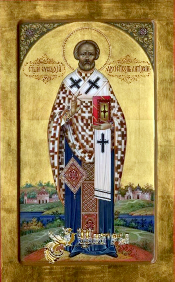 Святитель Евстафий был глубоко образованным Богословом, а также отличался обширными познаниями в науках светских. Когда на Востоке стала распространяться ересь Ария, не признававшего Единосущия Сына Божия со Отцом, святитель Евстафий ревностно боролся – устно и письменно – за чистоту Православной веры. В 325 году святым равноапостольным царем Константином Великим (306–337) был созван I Вселенский Никейский Собор. Первым председателем на этом Соборе был святитель Евстафий. Собор осудил учение Ария и изложил Православное исповедание в Символе веры. Неистового Ария, как назвал его святитель Евстафий, не пожелавшего отказаться от своего заблуждения, и его единомышленников Собор, лишив сана, отлучил от Церкви. Однако среди епископов, подписавших Никейский Символ, были и такие, которые сочувствовали ереси Ария и подписали акты Собора не по убеждению, а боясь отлучения. После Собора начались их происки против святителя Евстафия. С великой хитростью они добились его согласия на созыв в Антиохии Поместного Собора. Подкупив одну блудницу, они подговорили ее явиться на Собор с грудным младенцем и лжесвидетельствовать о том, что отцом младенца является святитель Евстафий. Нарушая Апостольские правила о том, что обвинение на священнослужителя следует принимать при подтверждении двух свидетелей, ариане объявили святителя Евстафия низложенным. Он без суда был отправлен в ссылку, во Фракию. Но ложность обвинения вскоре открылась: тяжко заболев после клеветы, женщина раскаялась, призвала клириков и в присутствии многих людей исповедала свой грех. Однако к этому времени святой Константин Великий умер, и на престол вступил его сын Констанций (337–361), разделявший еретические взгляды Ария и покровительствовавший арианствующим епископам. Святитель Евстафий и в ссылке все так же ревностно боролся за Православие. Скончался в ссылке, в городе Филиппах или Траянополе, в 337 году.