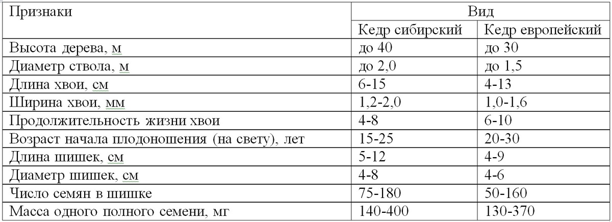 В принципе, можно. Можно, но сложно и не всегда. Обычно считается и пишется в книгах, что у кедра европейского всё мельче: высота дерева, длина хвои, размер шишек, масса семян. Если обобщить и суммировать информацию по основным морфологическим признакам, измеренным в природе, то получится вот такая таблица: