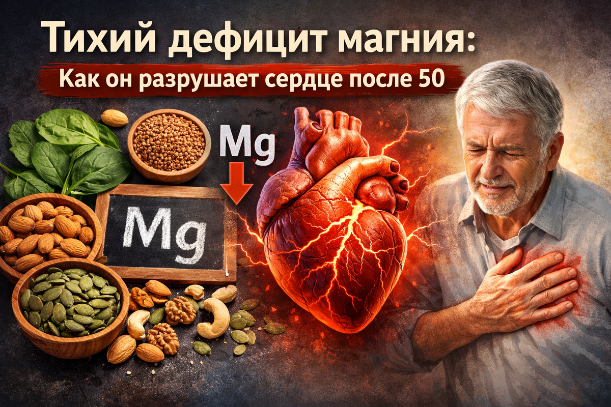 Большинство людей после 50 лет внимательно следят за холестерином, давлением и сахаром. Но есть ещё один показатель, о котором почти никто не думает — магний. И это странно, потому что именно его нехватка может незаметно подтачивать сердце годами. Самое опасное — дефицит магния редко даёт яркие симптомы. Человек может чувствовать лишь усталость, лёгкую раздражительность или перебои в сердце, списывая всё на возраст. А в это время сердце работает в условиях постоянного минерального голода. Разберёмся, почему это происходит и чем это может закончиться. Магний — один из ключевых минералов для сердечно-сосудистой системы. Он участвует более чем в 300 биохимических реакциях организма. Для сердца он выполняет сразу несколько функций: Если магния становится мало, сердце начинает работать буквально «на износ». Исследования показывают: низкий уровень магния связан с повышенным риском аритмий, гипертонии и ишемической болезни сердца. С возрастом баланс магния в организме меняется. Причин несколь