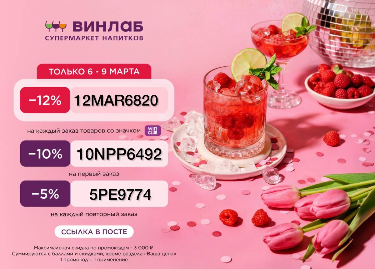 Только с 6 по 9 марта в ВинЛаб действует дополнительная скидка 1️⃣2️⃣🆗 на каждый заказ товаров со значком WinClub по промокоду