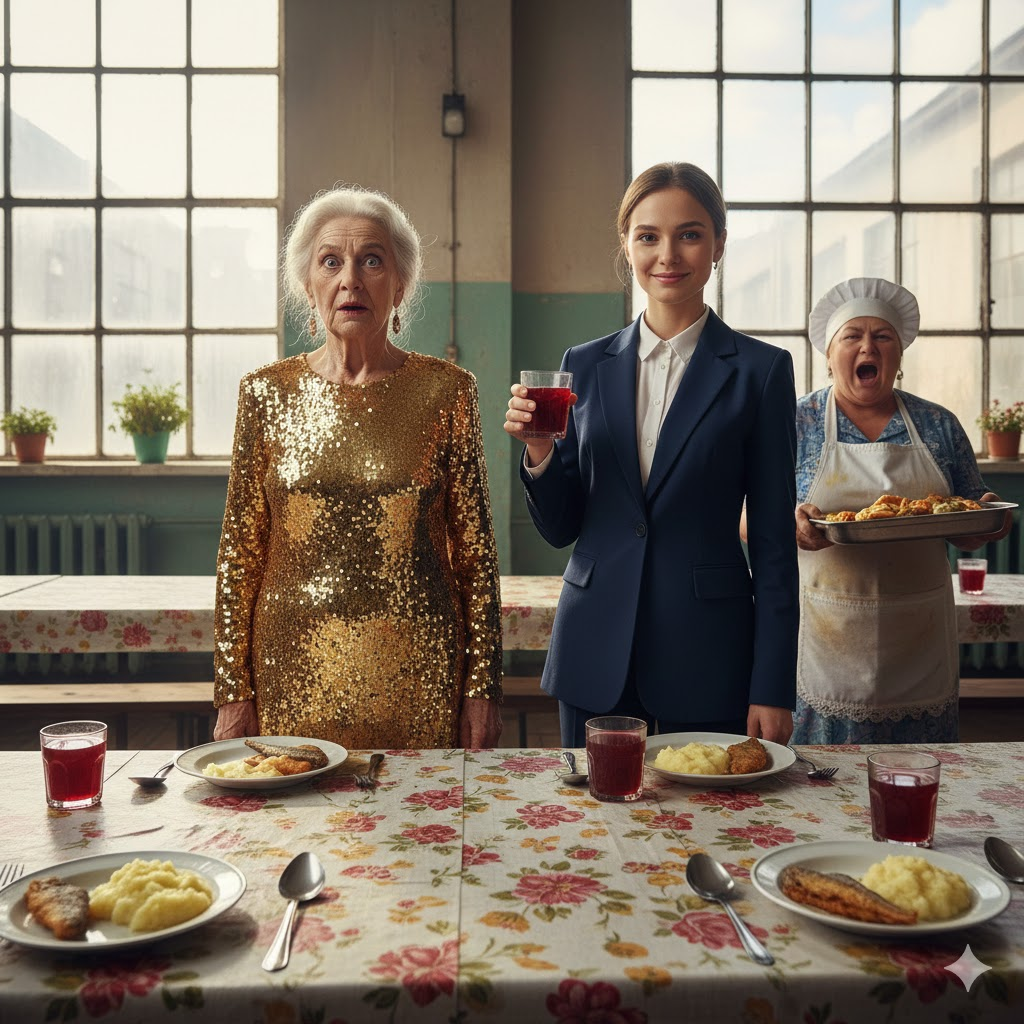 Суббота. 16:00. У входа в столовую начали собираться гости. Клавдия Петровна прибыла в том самом платье в пайетках, которое на фоне обшарпанной вывески «Столовая» выглядело как диско-шар, случайно упавший в угольную шахту.