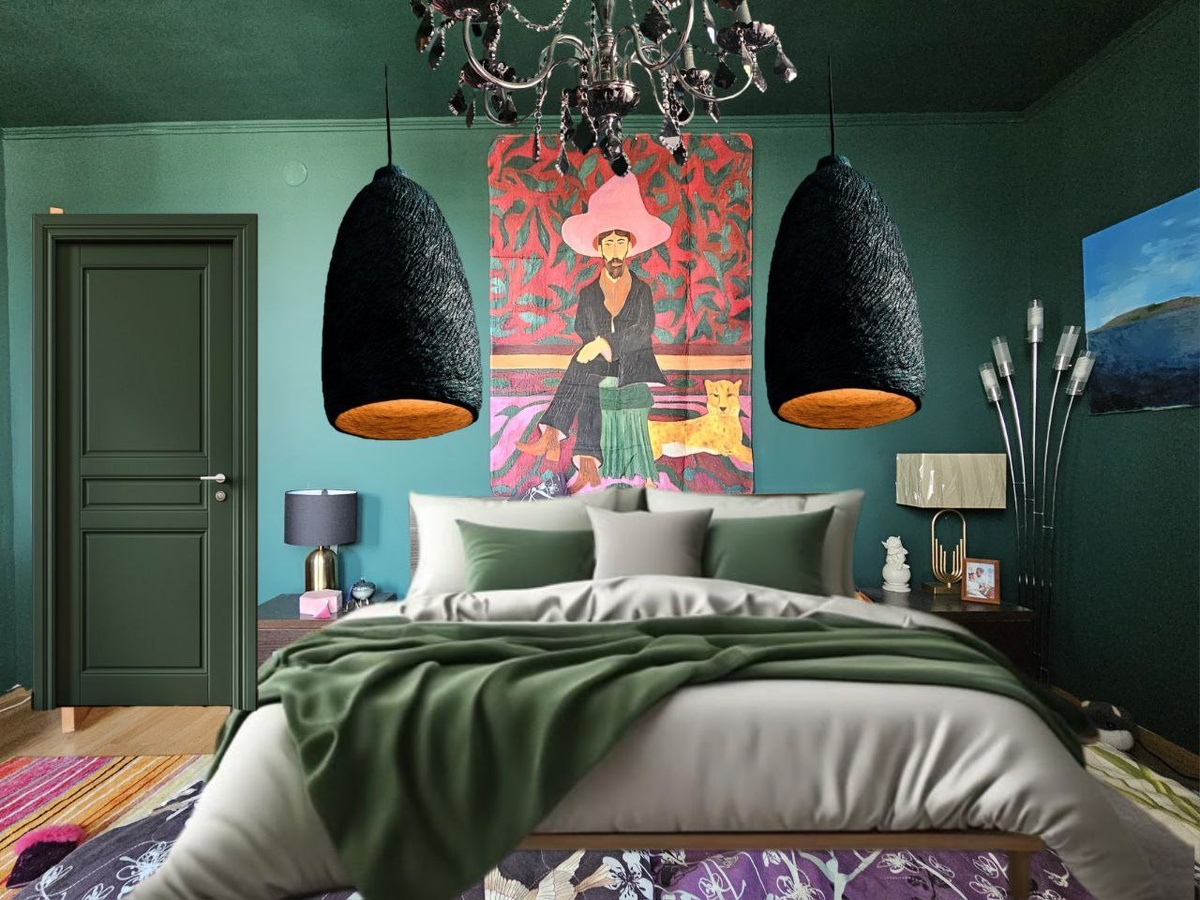 Зелёный вкруг - стены и потолок. Фуксия, пыльная роза, чёрные акценты и фьюжн. Это восторг!!! 🔥 Видео как я красила эту комнату взбудоражило чатик маляров 😅😅😅 Получился тест краски и офигенный результат. Я поняла что на ряду с проектами для заказчиков я скучаю по цвету. Хотя, как архитектор я в гармонии с минимализмом, но красочно го треша никто не отменял. Бунтарь и нигилист 🤣🤣🤣