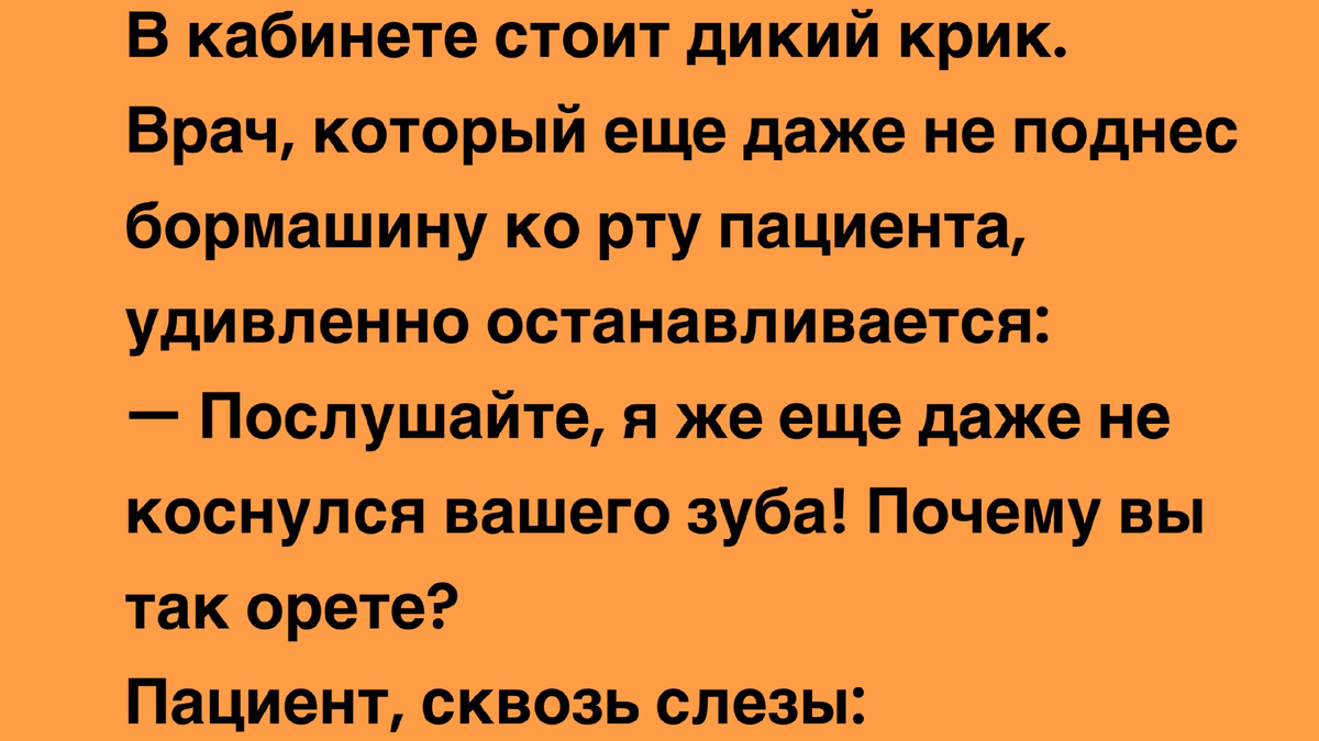 Кстати, этот анекдот напоминает нам о силе самовнушения и страха. Звуки из кабинета стоматолога — это отдельный жанр хоррора. Даже если там просто жужжит миксер для пломбировочного материала, сидящие в коридоре уже рисуют в воображении картины средневековых пыток. Врач просто грамотно использовал психологию масс. Эффективный тайм-менеджмент 80-го уровня!