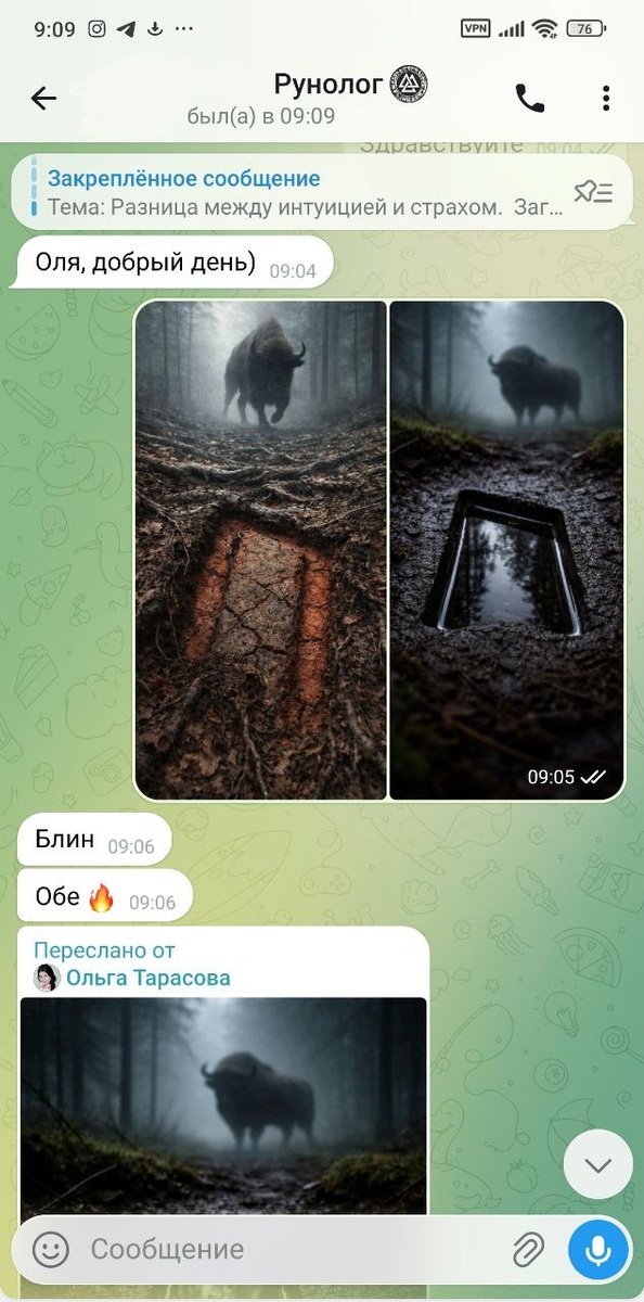 ! ☕️ Наливайте кофе, сегодня покажу вам немного своего творческого "закулисья"😆 На данный момент я работаю над рубрикой "Руна и её тотемное животное" Сегодня в работе у меня была руна Уруз (ᚢ) и её тотем, зубр. Задача была непростая: показать первобытную, неукротимую мощь, но сделать это тонко, без банальщины. Решили пойти через след — отпечаток силы, оставленный на самой земле. На финальном этапе мы с заказчиком встали перед выбором, какую из двух сильных концепций будем оживлять для видео: 1. Вариант слева: "Сила как шрам". Яростный, горячий след, который рвет корни. Ощущение физической, сокрушительной мощи. 2. Вариант справа: "Сила как портал". Идеальный, холодный отпечаток, как черное зеркало, в котором отражается древний лес. Тихая мощь и глубокая тайна. Как видите по нашей переписке, выбор был непростым, но чашу весов перевесила мистическая глубина. Мы остановились на втором варианте — "Черном зеркале". Но мне всё равно дико интересно ваше мнение! Это классика творческог