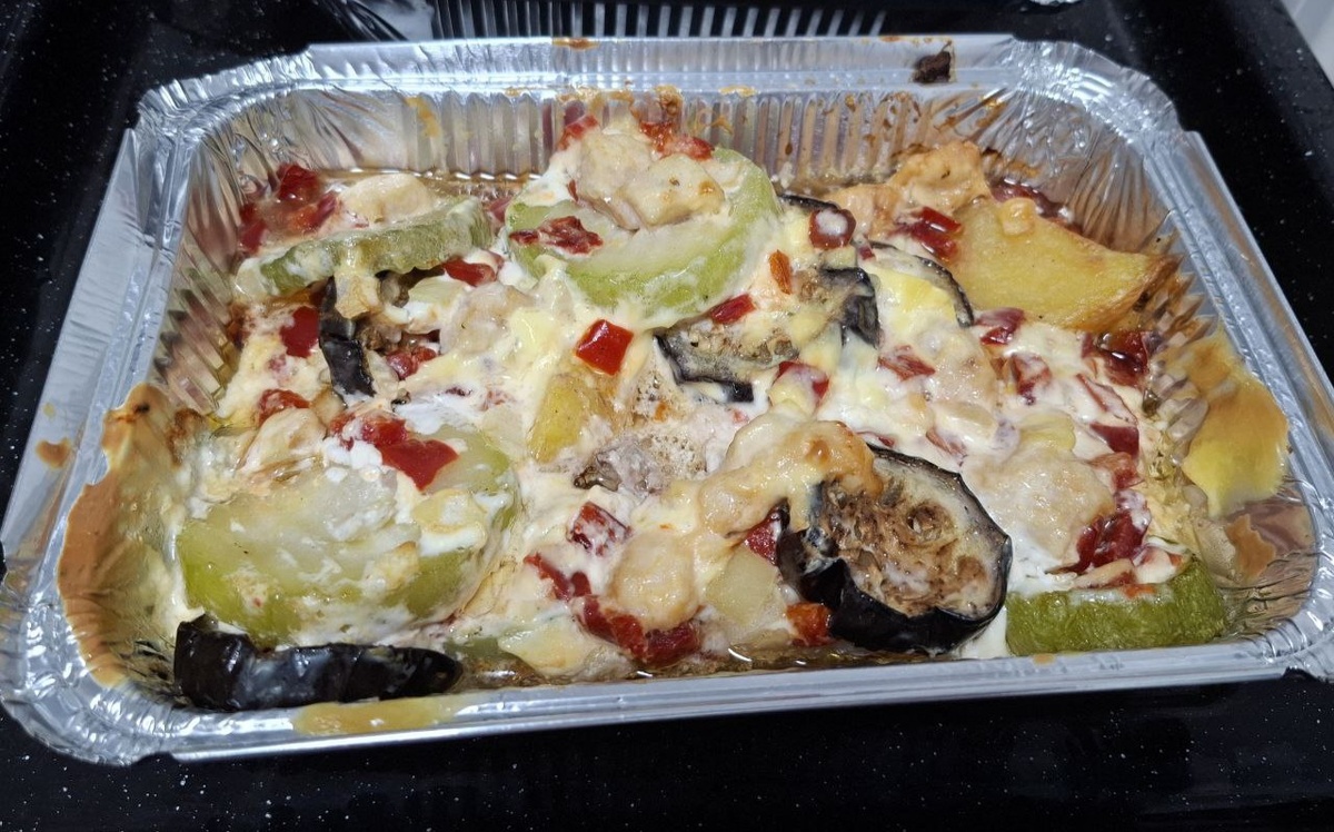 1. Распределить овощи по формам, нарезать куриное филе кубиком и добавить к овощам.