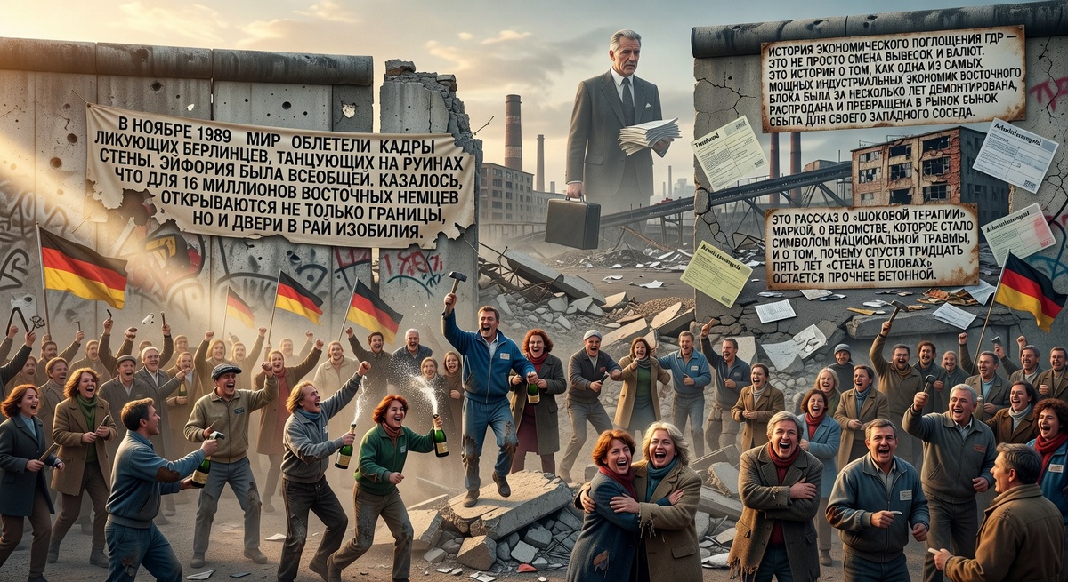 В ноябре 1989 года мир облетели кадры ликующих берлинцев, танцующих на руинах стены. Эйфория была всеобщей. Казалось, что для 16 миллионов восточных немцев открываются не только границы, но и двери в рай изобилия. Однако менее чем через год выяснилось, что путь в этот рай вымощен не розами, а чеками на пособие по безработице и акциями предприятий, которые почти никто из них не смог купить. История экономического поглощения ГДР — это не просто смена вывесок и валют. Это история о том, как одна из самых мощных индустриальных экономик Восточного блока была за несколько лет демонтирована, распродана и превращена в рынок сбыта для своего западного соседа. Это рассказ о «шоковой терапии» маркой, о ведомстве, которое стало символом национальной травмы, и о том, почему спустя тридцать пять лет «стена в головах» остается прочнее бетонной.