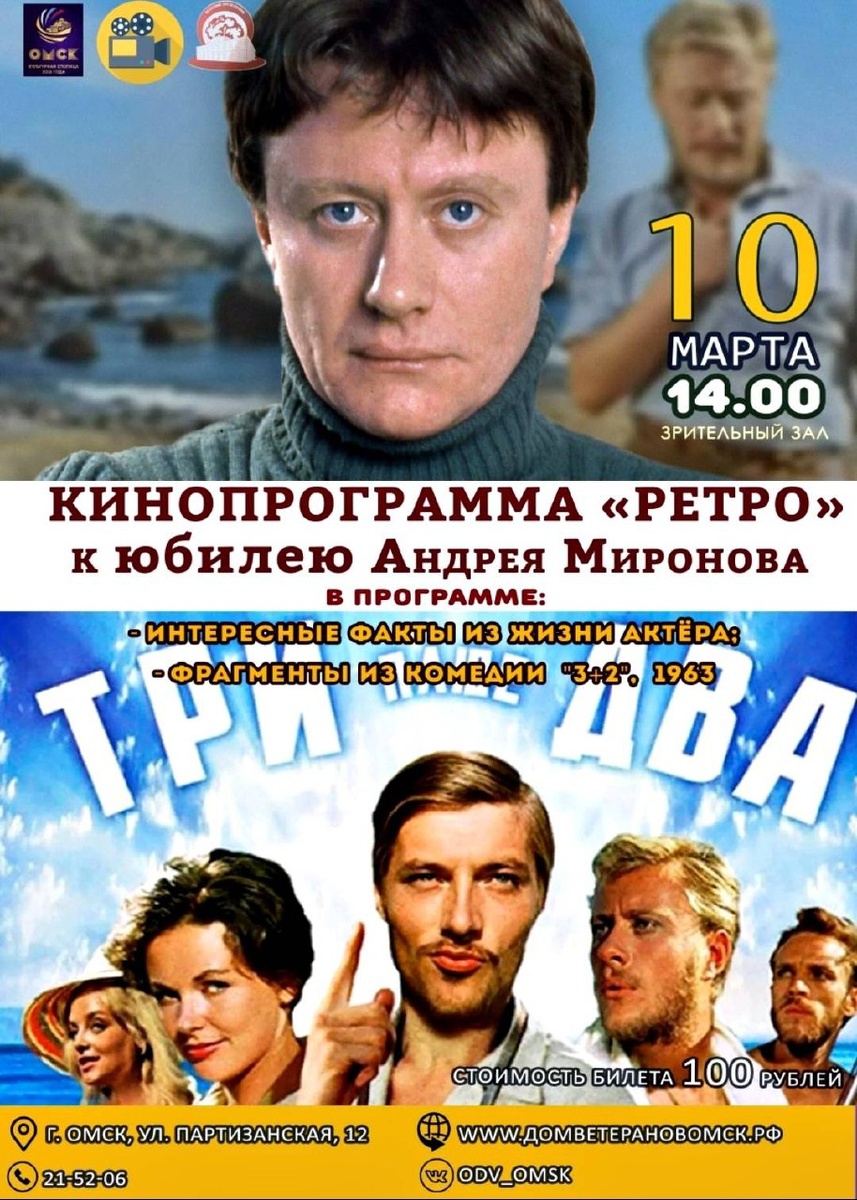 Приглашение на кинопрограмму Ретро, посвященную юбилею актера Андрея Миронова. В программе интересные факты из жизни актера и фрагменты из комедии. Начало: 10 марта 2026 14:00 Стоимость: 100.0 руб. Адрес: г Омск, Партизанская, 12 Организатор: https://vk.com/public216051626 ЛАО ТОС "Светлый" Приглашение на КИНОПРОГРАММУ «РЕТРО» к юбилею Андрея Миронова. Комитет ТОС "Светлый" информирует жителей микрорайона о том, что 10.03.2026г. в 14:00 в областном Доме ветеранов в Зрительном зале состоится КИНОПРОГРАММА «РЕТРО» к юбилею Андрея Миронова. В программе: интересные факты из жизни актера, фрагменты из комедии « 3+2», 1963г. Стоимость билета 100 рублей. Адрес: ул. Партизанская, 12. ДОМ ВЕТЕРАНОВ. Ссылка на сайт: WWW.ДОМВЕТЕРАНОВ.РФ Телефон для справок: 21-52-06.... #общество_люди Узнать подробности, адрес или записаться на событие.