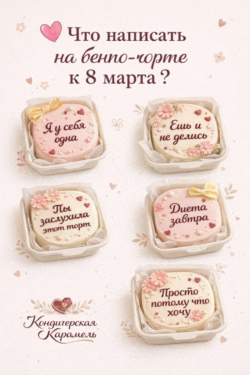 : что написать на бенто-торте к 8 марта, чтобы было не банально? 🌺 «С 8 марта» - мило, но иногда хочется чего-то более личного, смешного или неожиданного. Вот несколько идей надписей на бенто-торте: 💗 Для подруги: — «Ты заслужила этот торт» — «Немного сладкого для сладкой жизни» — «Красота спасёт мир… и этот торт» 💕 Для мамы — «Маме можно всё» — «Самой заботливой» — «Мам, это тебе (но поделись)» 🍬 Для себя — «Я у себя одна» — «Просто потому что хочу» — «Сладкая жизнь начинается сегодня» 😄 С юмором — «Ешь и не делись» — «Диета начнётся завтра» — «Съешь меня» Какую надпись выбрали бы вы? Напишите в комментариях - соберём ещё больше идей 🩷 #бентоторты #бентоназаказ #бенто8марта #идеидляторта #кондитерскаякарамель