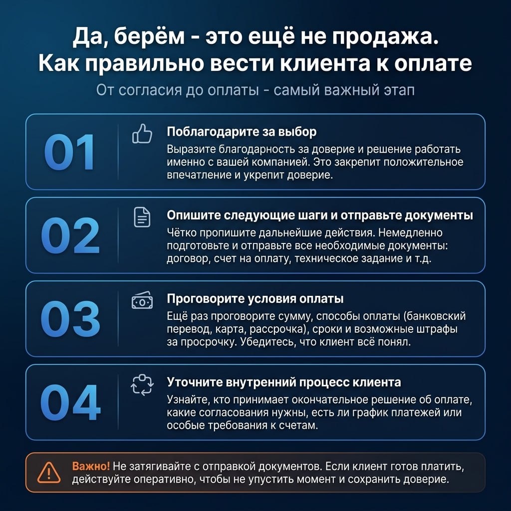 Как правильно вести клиента к оплате 👇 Клиент сказал заветное «Да, берём». 🔥Радуемся - но не расслабляемся. Пока деньги не пришли, сделка ещё не закрыта. И промежуток от согласия до оплаты - один из самых важных в продажах. 💡 Как правильно вести клиента до финала? Вот план: 1️⃣ Поблагодарите за выбор. «Отличная новость, спасибо за доверие!» — пусть клиент почувствует вашу искреннюю радость. Это важно: когда выбор человека встречают с теплом, он утверждается в своём решении ещё сильнее. 2️⃣ Опишите следующие шаги и сразу отправьте документы. «Готовлю договор и счёт - пришлю на почту в течение часа.» Не тяните. Пока клиент "горячий" - действуйте быстро. Если процесс объективно требует времени (например, договор готовит юрист), всё равно обозначьте сроки: «Завтра к 15:00 документы будут у вас» - и держите слово. 3️⃣ Проговорите условия оплаты. «Оплата в течение 5 рабочих дней» или «Счёт действителен до 25-го числа» - чёткий дедлайн обязателен. Если клиенту нужны другие сроки - об