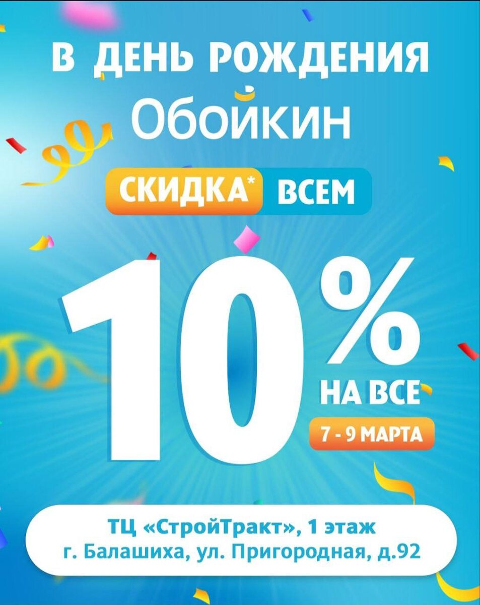 ! В честь дня рождения мы дарим всем покупателям скидку 10% на обои, краску, лепной декор и напольные покрытия! Акция пройдет с 7 по 9 марта во всех магазинах нашей сети и на сайте! Предложение суммируется со скидкой по дисконтной карте. Весь ассортимент можно посмотреть на сайте: https://www.oboykin.ru Чтобы узнавать обо всех наших новинках, новостях и акциях, подписывайтесь на Telegram-канал: https://dzen.ru/id/5fff0b1328316e0e2a38aa8d Подробности по телефону: +7 (495) 627-75-75 доб.513 #commercial #3