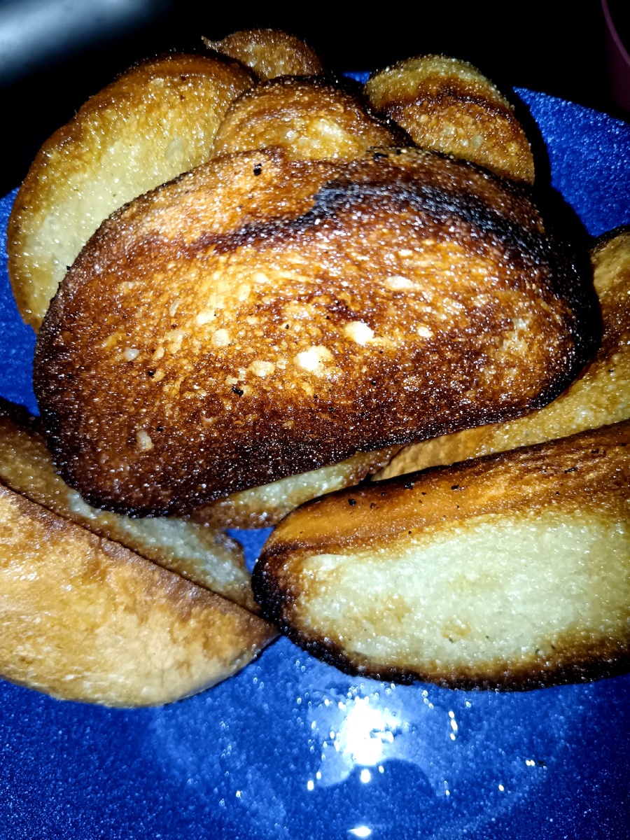На сковородке кусочки батона обмакивали в тёплой смеси из яиц и молока, затем шли в горячее масло. Гренки шипели, пока корочка не стала золотистой и хрустящей, а внутри — мягкой и тёплой.
