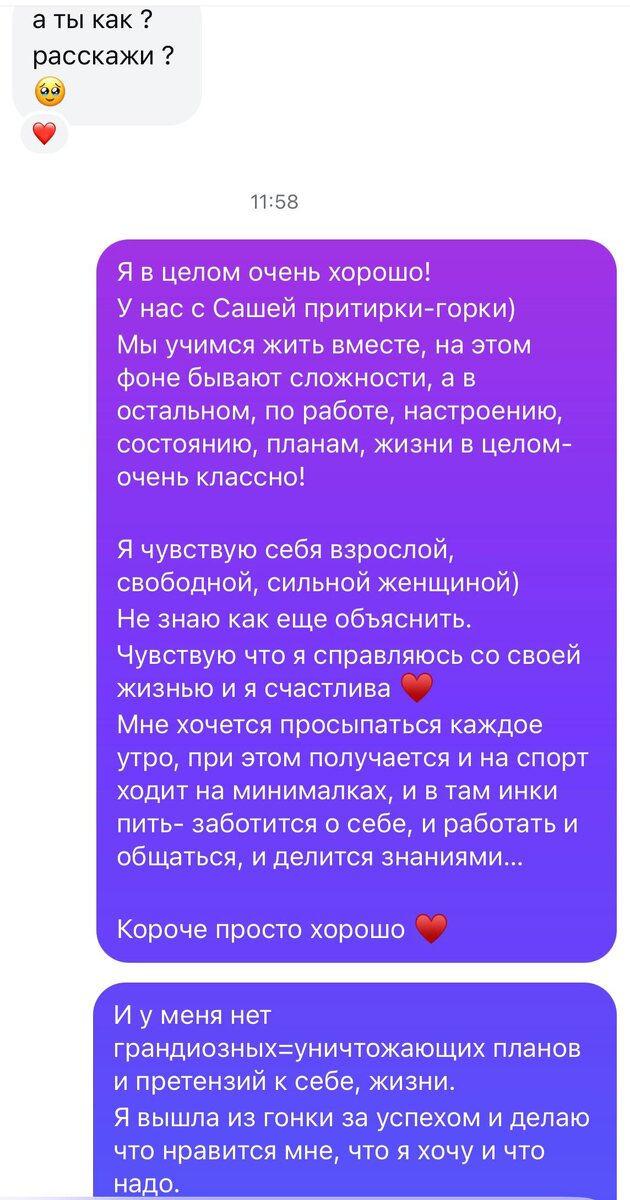 Я хочу поделиться ответом с вами. Моя главная победа: я перестала смотреть на успешный успех и к нему стремиться, перестала гнобить себя за то, что мало делаю или что-то не успеваю, за то, что я должна быть лучше, выше, круче. Я, кажется, смирилась с тем, что я просто человек)