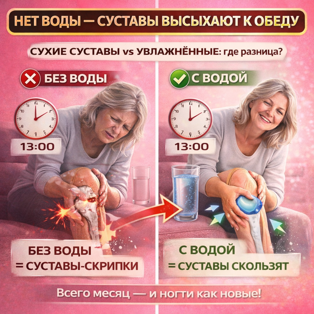 К обеду колени не сгибались, пальцы не разжимались. Врач спросил: «А воду пьёте?» Всё изменилось за 5 дней! Мне 56. К обеду мои колени начинали «деревенеть». Пальцы сгибались с трудом. Встать со стула — целое событие. Я думала — возраст, артроз, что поделать. Пила таблетки, мазала мази. Ноль эффекта. Пока однажды врач не спросил: «А сколько воды вы пьёте в день?» Я ответила честно: «Чай утром, кофе днём. Воду не пью — не хочется». Он посмотрел на меня и сказал: «Вот и ответ. Ваши суставы высыхают к обеду. Буквально». Врач объяснил просто: «В суставах есть синовиальная жидкость. Это как смазка. Она на 80% состоит из воды. Когда ты не пьёшь — жидкости становится меньше. Суставы трутся друг о друга. К обеду они уже «сухие» — отсюда скованность». Вот что происходит: «Ты не пьёшь воду — суставы высыхают. Вот и всё», — сказал врач. Я решила проверить. Поставила задачу: пить 1,5 литра воды в день. Чистой воды, не чая. День 1: К обеду колени всё равно скованные. Думаю: «Ерунда какая-то». День