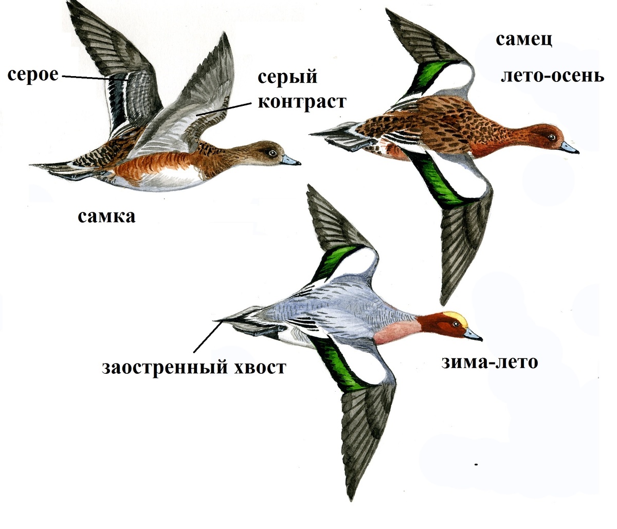 ВНЕШНИЙ ВИД Плотная утка средних размеров с небольшой головой, короткой шеей, коротким клювом. Самец в брачном наряде хорошо отличается характерной окраской; белое поле на крыле заметно и у сидящих птиц. Шея и голова коричнево-рыжие, ото лба до темени идет яркая золотисто-желтая полоса. Верх тела и бока серые с тонким струйчатым рисунком, зоб винно-серый. На крыле ярко-зеленое с фиолетовым отливом зеркало, окантованное спереди и сзади черными полосами, перед ним большое белое поле. Брюхо белое, ноги темно-серые. Клюв голубоватый с черным кончиком. У самка наиболее распространенная морфа – рыжая, пестрины не так четко выделяются на темном общем фоне, как у самок других уток, издали птица может выглядеть темной, однотонной. В ПОЛЕТЕ хорошо заметен контраст между темной грудью и белым брюхом, короткая шея и острый хвост; у самца старшего возраста – белое пятно на крыле, служащее ключевым определительным признаком вида на расстоянии. Полет быстрый, маневренный. ГОЛОС Селезень в брачный пер
