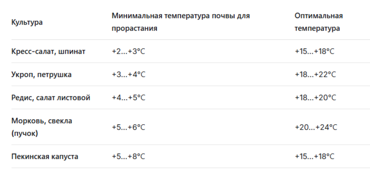 Как измерить: Обычный уличный термометр закопайте на 10–15 см в грядку на 15–20 минут. Минимальные температуры почвы для посева: 👉 Важно: Если температура почвы ниже указанной, семена могут лежать в земле неделями и не взойти. Прогрейте грядку (пролейте горячей водой и накройте пленкой за 3-5 дней до посева), и вы сдвинете сроки получения урожая на 1-2 недели. В марте в теплице днем может быть жарко (до +20°С), а ночью температура падает до -5…-10°С. Вот какие перепады выдерживают культуры без потерь: 1. Экстремалы (сеем смело в начале марта): 2. Умеренно-стойкие (сеем в середине-конце марта): 3. Неженки (сажать в марте только с укрытием): Температурные качели — главная проблема ранней посадки. Вот что нужно сделать, чтобы помочь растениям: Следуя этим правилам, вы сможете точно определить когда можно первые культуры посеять в теплице, и получить зел