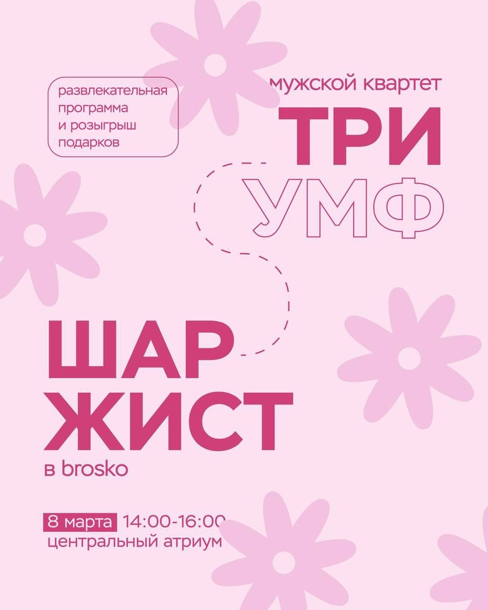 » ✔ Выступление мужского квартета с мощными вокальными партиями. ✔ Классическая подача и яркая сценическая харизма артистов. ✔ Развлекательная программа для гостей атриума. ✔ Розыгрыш подарков среди зрителей. 📅 Когда: #8_марта 14:00–16:00 ⛳ Где: центральный атриум Brosko 💳 Вход свободный 👉 Афиша Хабаровска. Куда сходить, экскурсии