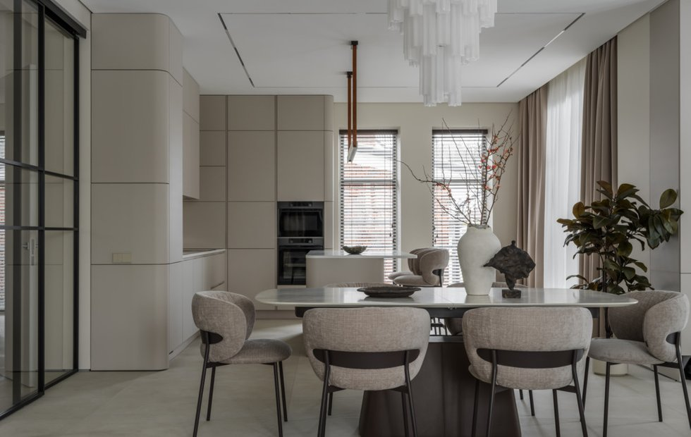 Двухэтажный дом в Подмосковье: радиусные формы, натуральный мрамор и теплый беж