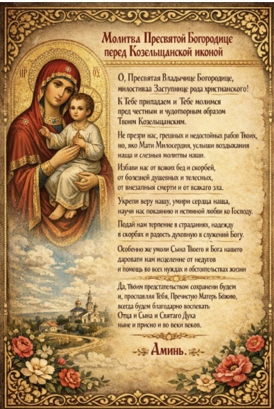 Богоро́дице Де́во Пренепоро́чная Ма́ти Христа́ Бо́га на́шего, Засту́пнице всего́ ро́да христиа́нскаго! Чудотво́рней ико́не Твое́й благогове́йно предстоя́ще, мо́лим Тя, услы́ши нас, моля́щихся Тебе́: приими́ благодаре́ния на́ша недосто́йная о всех неизрече́нных Твои́х к нам благодея́ниих, в ме́сте сем и во мно́гих ве́сях и гра́дех земли́ Росси́йския явле́нных и явля́емых; Ты бо еси́ больны́х