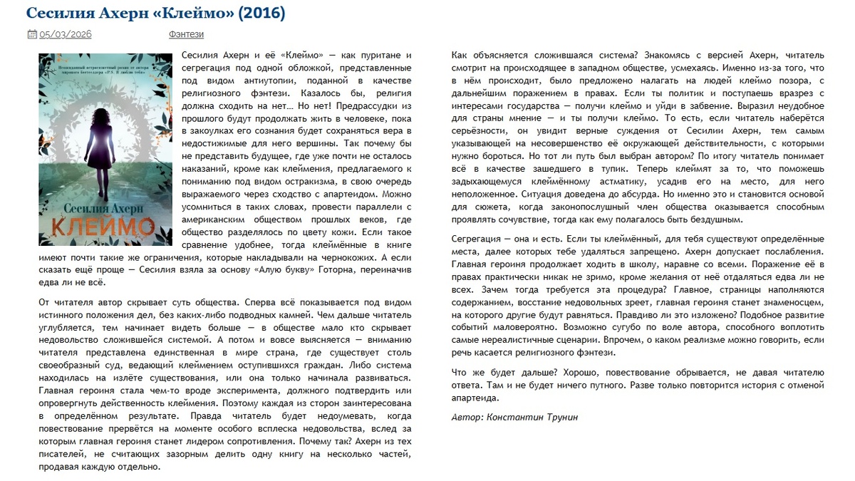 Сесилия Ахерн «Клеймо» (2016) | Критика