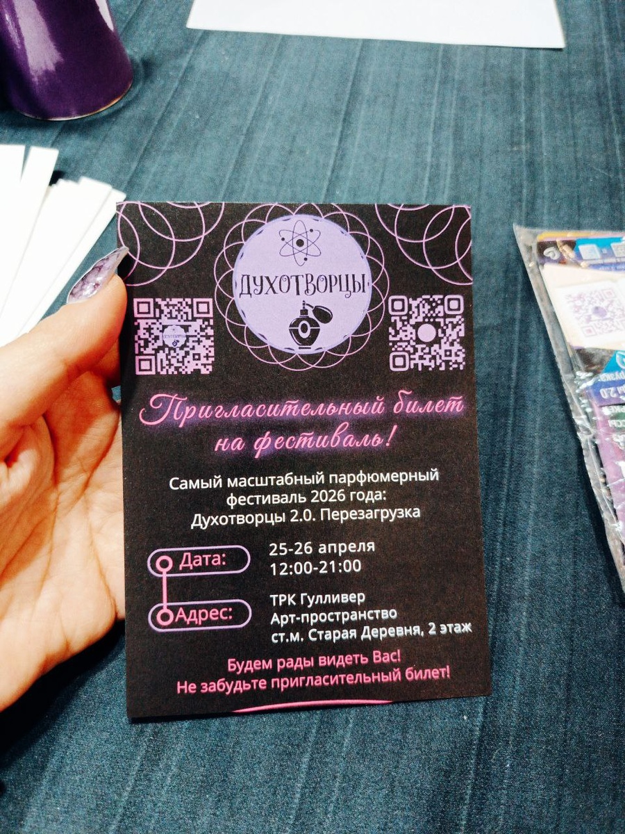 ! Что это за пригласительный такой билет? Он достаётся только вип персонам/медийным личностям, входящих в состав жюри, либо тех, кто хочет приобрести полный спектр развлечений на нашем фестивале. Что даёт такой билет? Участие в: Парфюмерных мастер-классах, лекциях Создании аромата в парфбаре Создании мыла/свечи Возможность стать участником жюри Что нужно сделать, чтобы выиграть билет? - быть подписчиком в наших соц.сетях, естественно - поставить + под этой записью - не выходить из групп до конца розыгрыша Итоги розыгрыша будут подведены 25 марта! Поехали! Розыгрыш проводится тут https://vk.com/aromafestival Билеты на нашем сайте duhotvorci.ru/festival Группа в вк с лекциями и мк vk.com/duhotvorci Наши каналы в тг t.me/aromafestival https://dzen.ru/id/67161f3ee4dbf35e3680a324 #духотворцы #фестиваль #фестивальДухотворцы #парфюмерия #спб