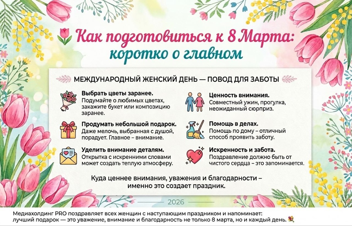 Международный женский день — отличный повод напомнить близким женщинам, насколько они важны. Лучшее решение — подготовиться заранее: выбрать цветы, продумать небольшой подарок и уделить внимание деталям. Даже простая открытка или искренние слова могут создать по-настоящему тёплую атмосферу весеннего праздника. Не обязательно гнаться за дорогими подарками. Куда ценнее внимание: совместный ужин, прогулка, неожиданный сюрприз или помощь в домашних делах. Важно, чтобы поздравление было искренним и показывало заботу — именно это чаще всего запоминается. Медиахолдинг PRO поздравляет всех женщин с наступающим праздником и напоминает: лучший подарок — это уважение, внимание и благодарность не только 8 марта, но и каждый день. 🤩 PRO News | Boost От всей редакции холдинга