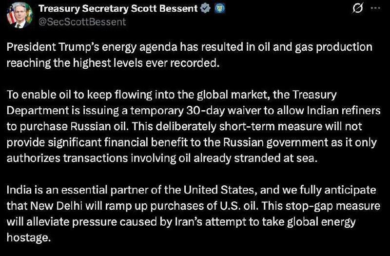 США разрешили Индии 30 дней покупать "застрявшую в море" на танкерах российскую нефть, подтвердил глава американского минфина Бессент