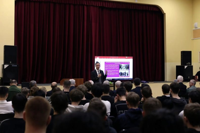 Спикер мероприятия - руководитель регионального штаба Бессмертного полка России, председатель РО Всероссийской организации ветеранов Сахалинской области, лектор российского общества "Знание" полковник в отставке Андрей Юрьевич Фугенфиров рассказал студентам об истории Вооруженных Сил страны, охватывающий период с января 1918 года по наши дни.