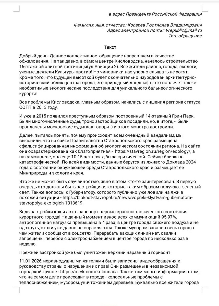 Обращение жителей Кисловодска в Аппарат Президента РФ.