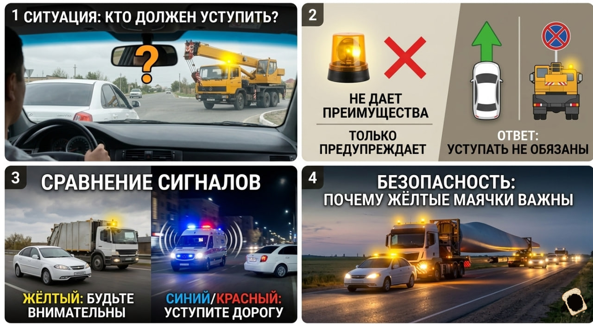 Когда речь заходит о правилах дорожного движения, большинство водителей думают о легковых автомобилях. Но на дорогах регулярно встречается специальная техника — автокраны, манипуляторы, дорожные машины и коммунальный транспорт. И именно здесь часто возникают спорные ситуации. Разберём один типичный вопрос из экзаменационных тестов по ПДД. Представим следующую ситуацию. По дороге движется грузовик со специальным оборудованием — например, автомобиль с краном-манипулятором. На крыше включён проблесковый маячок жёлтого цвета. Перед перекрёстком водитель легкового автомобиля задаётся вопросом: Обязан ли он уступить дорогу такой спецтехнике? Варианты ответа обычно выглядят так: Правильный вариант — №2: уступать дорогу не обязательно. Жёлтый проблесковый маячок не даёт преимущества в движении. Он используется только для того, чтобы предупредить других участников движения о потенциальной опасности. Такие маячки устанавливаются на: Их задача — привлечь внимание водителей. Например: Но юридическ