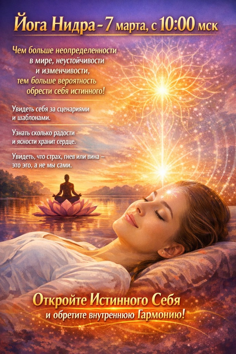 и шаблонами. Узнать сколько радости и ясности хранит сердце. Увидеть, что страх, гнев или вина - это эго, а не мы сами. Йога Нидра - 7 марта, с 10:00 мск Участие в практике онлайн (запись будет) - 800 руб. Оплата по номеру тел. 89037642214 или на сайте Йога-Нидра 7 марта 10:00 Мск. (https://vedahomam.ru/joga-nidra/) Элена Шанти Деви Мара (написать в личку) Ведические духовные практики Ссылка на канал Вконтакте Ссылка на канал в Max