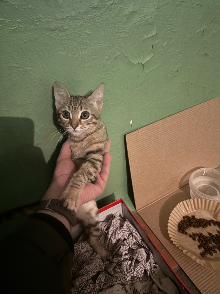 В подъезде оставили маленького котенка. Сидит там со вчерашнего вечера😔
