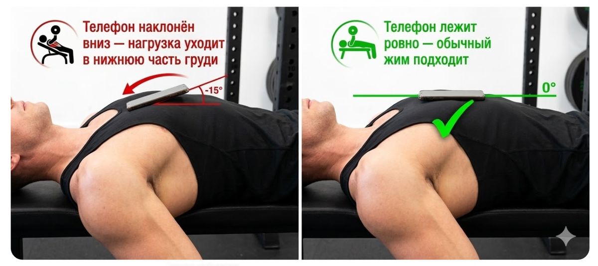 Коротко и по делу: если штанга годами отдаёт ростом плечам и трицепсу, переключитесь на контроль, амплитуду и угол, а не на вес. Ниже — два упражнения с чёткими техниками, темпом и признаками прогресса. Задача: дать грудным возможность двигаться по естественной дуге и работать в растянутой позиции, а не «передать» нагрузку дельтам и трицепсу. Как подобрать угол (быстрый тест): положите смартфон на центр грудины в положении лёжа. Если он наклонён вниз в сторону ног — нужен наклон скамьи 20–40°; если ровно — плоская скамья или небольшой наклон. Техника (ключевые моменты): Темп и объём: 3–4 подхода по 6–10 повторений; медленное опускание (2–3 с), контролируемый подъём. Это даёт акцент на растянутую фазу, важную для гипертрофии. Признак правильной работы: в сете вы чувствуете «горение» в грудных, а не в передних дельтах; если горят только плечи — измените угол или технику. Задача: создать высокий напряжённый растягивающий стимул в нижней фазе движения, минимизировать «воровство» дельт. Пос