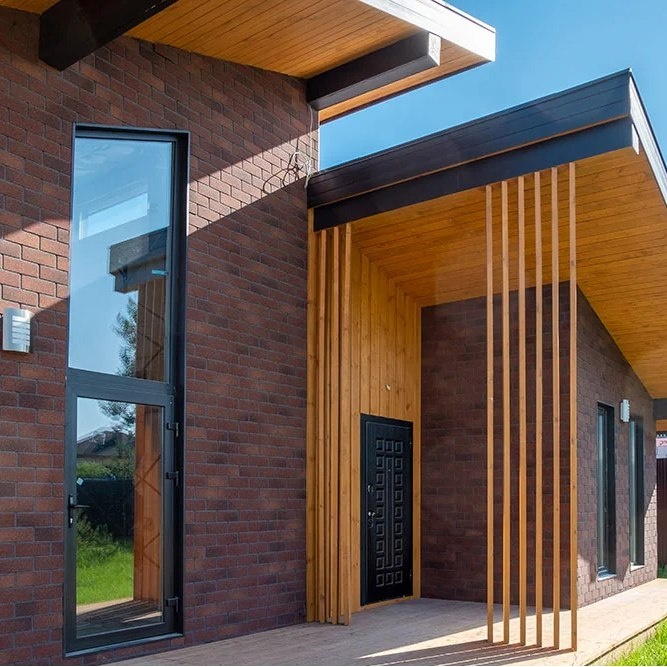 При проектировании дома важно учитывать, как будут сочетаться кровля и облицовка фасада. Если один из элементов выбивается по тону или текстуре — вся композиция теряет цельность. Вот несколько принципов гармоничного сочетания: — Тёплое с тёплым: терракотовая черепица — с песочной, охристой, красной плиткой. — Холодное с холодным: серый, антрацитовый, графитовый клинкер — с черепицей в аналогичных оттенках. — Контраст работает: тёмная крыша + светлый фасад — классика. Главное — не перегружать детали. — Швы имеют значение: белый или цветной шов может «собрать» или «разорвать» цветовую схему. — Текстура важна: матовая черепица + гладкая плитка = современно; структурная плитка + черепица с волной = более классический вариант. Грамотное сочетание плитки и черепицы делает дом цельным, эстетичным и завершённым — без необходимости «додумывать» архитектуру за счёт дополнительных элементов.