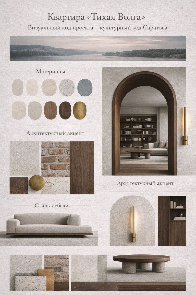 » Каждый сильный интерьер начинается не с мебели и не с цвета стен. Он начинается с истории места. Работая над концепцией однокомнатной квартиры, я задала себе вопрос: какой характер у города Саратов? Это город широких горизонтов и спокойной силы. Город, где рядом существуют купеческая архитектура, индустриальная история и интеллигентная культурная среда. Так появилась идея квартиры «Тихая Волга». Главный образ интерьера — ощущение воздуха и спокойствия большой реки. Пространство построено на длинных горизонтальных линиях, мягких фактурах и спокойной палитре. В интерьере используются натуральные материалы: тёплый дуб, минеральная штукатурка, текстиль, латунные детали. Они создают ощущение глубины и тактильности — как старые купеческие дома города. Цветовая палитра вдохновлена природой Волги: песочные оттенки, светлый известковый цвет стен, дымчато-голубые акценты и тёплое дерево. Важный элемент проекта — архитектурный акцент. Арочный портал и латунные детали отсылают к исторической арх