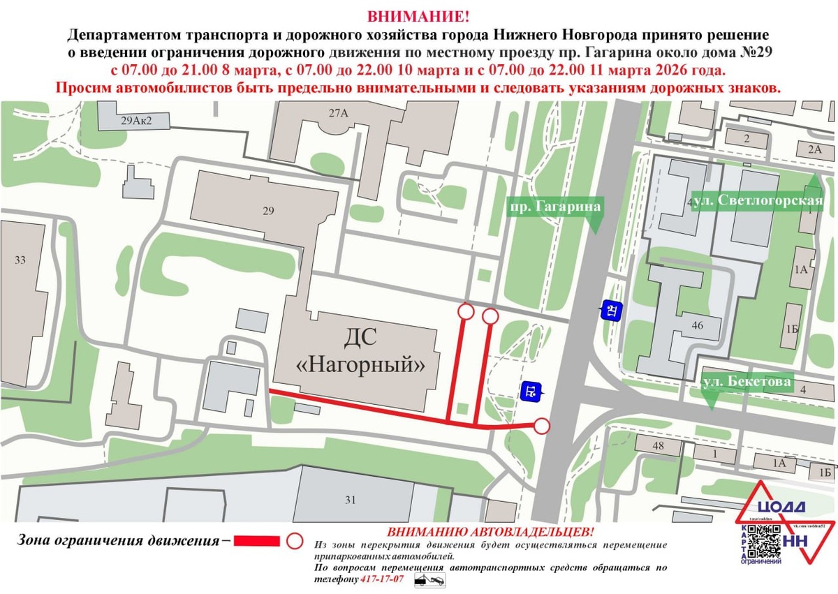 В Нижнем Новгороде временно ограничат движение транспорта по местному проезду проспекта Гагарина около дома №29. Об этом сообщили в городской администрации. Ограничения вводятся в связи с проведением спортивных мероприятий. Проезд будет закрыт в следующие даты: Объезд транспорта будет организован по прилегающим улицам. Водителей просят заранее убрать автомобили из зоны ограничений. Машины, оставленные на участках, где будет запрещена парковка, могут быть принудительно перемещены. Уточнить информацию о перемещенных автомобилях можно по телефону справочной службы: 417-17-07. Автомобилистам также рекомендуют быть внимательными и следовать указаниям дорожных знаков. Ранее Нижегородцев предупредили о риске подтоплений федеральных трасс во время весеннего половодья Фото: Мэрия Нижнего Новгорода