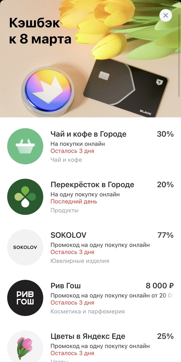 В Т-Банке у многих висит кэш 22% на Пятерочку в городе. И много всяких интересных предложений к 8 марта. Вчера воспользовалась кэшем на Пятерочку. В итоге заказ на 2 800, вернется 610. На днях хочу еще кофе купить впрок с