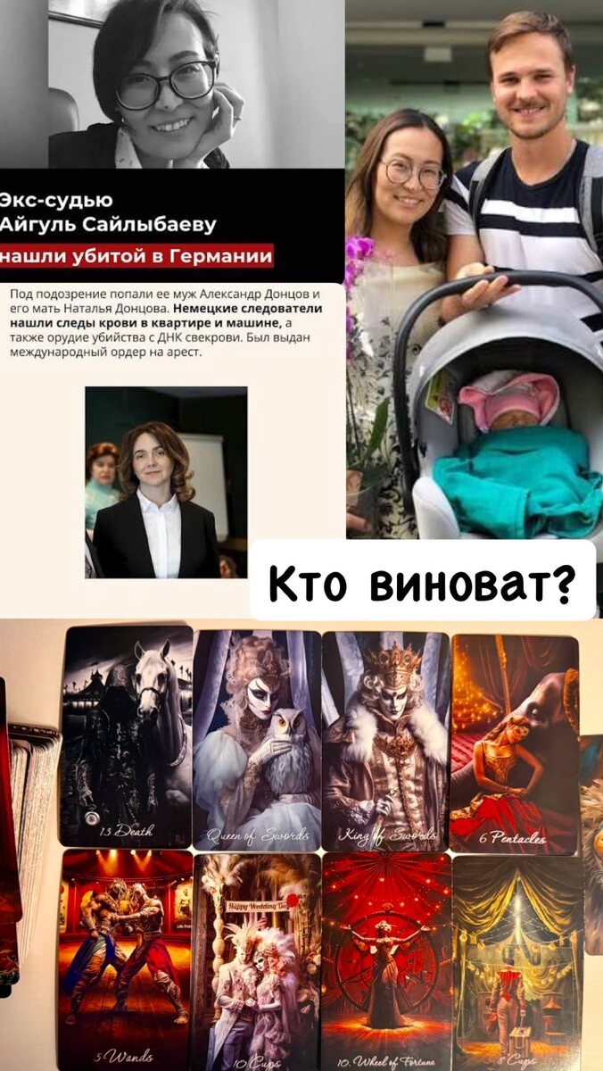 … Кто виноват в смерти Айгуль? БОльшая часть вины на «любимом муже» (Смерть). Очередная несостоявшаяся сыночка-корзиночка, неповзрослевшая и нездоровая, как и его мать-наседка (Король, Королева мечей), оба они стали палачами для беременной Айгуль, загубив 2 жизни. Психопатичное поведение—не диагноз, поэтому «вполне вменяемые» и образованные маман с сыном смогли провернуть такую расправу, так как знали законы и свои возможности. Главным героем стал сын, а мать помогла и готова «взять вину» на себя (10 кубков, 6 пентаклей). Но в этой истории оба - монстры, которым не место в обществе. У сынка сейчас хватает наглости и для публичности, виновным он себя не считает и будет стоять на своем до конца (5 жезлов). Преднамеренно или нет, но для своей покойной супруги этот человек в картах — СМЕРТЬ. Роковой человек, да и отношения эти были кармическими (Колесо Фортуны). У Айгуль шанс на спасение все-таки был, как и у Донцова не стать уби*ей матери своих детей, но он упущен. Сейчас же есть шанс д