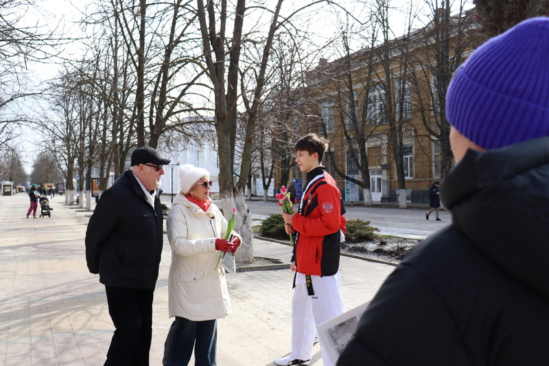 На Шахтинском Арбате и в Александровском парке «Шахтинские известия» вместе с клубом «Чёрный тигр» снова подарили горожанам неожиданный праздник! В прошлом году родилась добрая традиция: морозным утром корреспонденты вместе с боксёрами спортшколы № 1 вышли на праздничную пробежку — и это стало настоящим зарядом бодрости для всех! В этом году ребята из спортивного клуба «Чёрный тигр» (тренер — Юрий Якутов) устроили настоящий весенний марафон! Каждой девушке и женщине они вручали с улыбкой яркие весенние тюльпаны и свежий номер «Шахтинских известий». Весеннее настроение дарили: