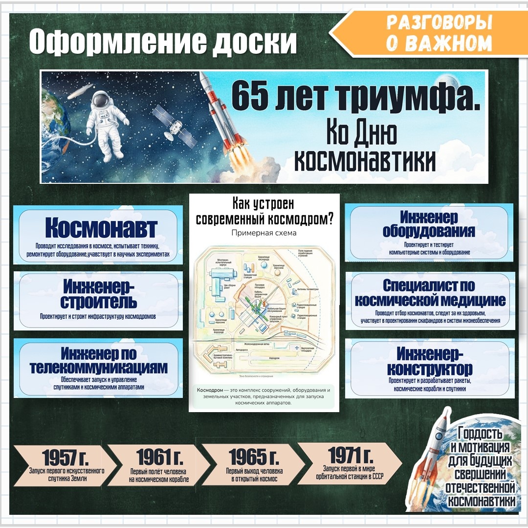 Оформление Ко Дню космонавтики и к Разговорам о важном на тему «65 лет триумфа. Ко Дню космонавтики». Комплект наглядных материалов разработан для проведения урока "Разговоры о важном" на тему "65 лет триумфа. К Дню космонавтики" (2026 г.) Комплект позволит наглядно и информативно представить ключевые этапы освоения космоса, структуру космодрома и многообразие профессий ракетно-космической отрасли. Состав комплекта: 2. Таблички-стрелочки "Важнейшие даты в истории освоения космического пространства". Представляют значимые исторические события, начиная с запуска первого искусственного спутника Земли (1957 г.) и первого полёта человека в космос (1961 г.), включая первый выход человека в открытый космос (1965 г.) и запуск первой орбитальной станции (1971 г.). Формат стрелочек позволяет хронологически выстроить информацию на стене или доске. 3. Иллюстрация "Земля" с тематической надписью. Визуализирует значимость отечественных достижений в области космонавтики, подчеркивая их роль как исто