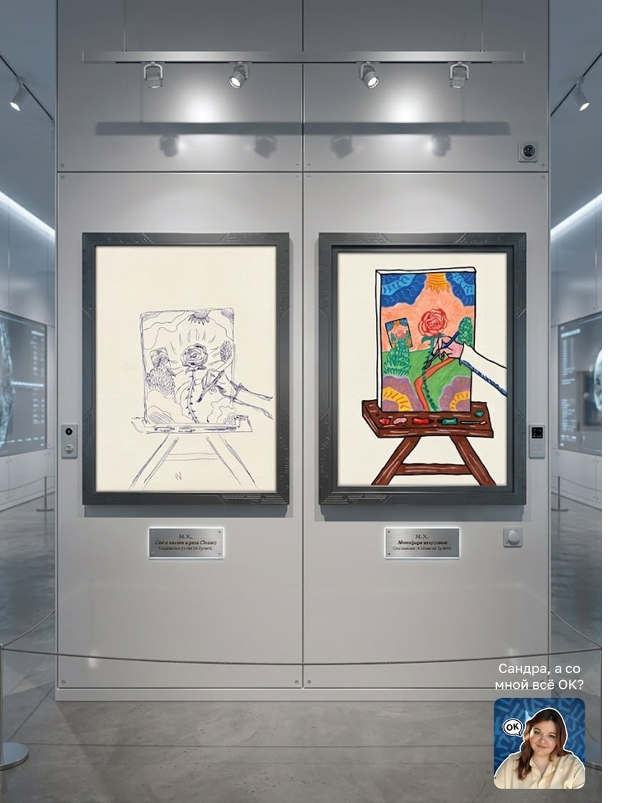 Работаю сейчас сама как коуч в коучинге (со специалистом по личностному росту), в результате одной из сессий придумала себе запечатлеть одно из убеждений как картину, в итоге получился черновой вариант и чистовой, а метафора развернулась дальше. Чисто из хулиганства добавила их как картины в музее. Всегда есть выбор, с какой позиции смотреть на убеждение. Иногда я как роза в центре холста, живая, наполненная, обладающая всеми нужными ресурсами. Я чувствую себя частью композиции, вписанной в границы, но цельной и завершённой в своём существовании. А иногда я автор, стоящий над холстом. С высоты взгляда я вижу всю картину целиком, чувствую замысел и могу перерисовать линии, если нужно. В этой позиции у меня уже есть понимание, куда ведёт процесс, где находится точка Б, и как из розы в центре рождается новая история. В этом цикле внутренней работы человек одновременно и картина, и художник, и рука, которая оживляет мазки. Я сама часто оказываюсь в этом тройственном танце, и каждый раз