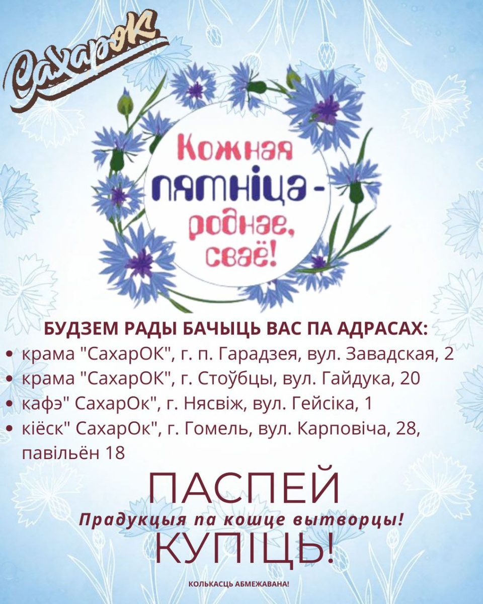 ! 🔥Увесь сакавік у нашых крамах, кафэ і кіёску ААТ "ГАРАДЗЕЙСКІ ЦУКРОВЫ КАМБІНАКТ" — асаблівая прапанова: прадукцыя па кошце вытворцы. Джэмы, канфіцюры, топінгі, сокі і нектары — усё, што стварае ўтульнасць і цеплыню беларускіх традыцый. 🎉 Не прапусціце! Завітайце ў гандлёвыя кропкі ў дзень акцыі і атрымайце лепшыя беларускія тавары па спецыяльных цэнах!🎉