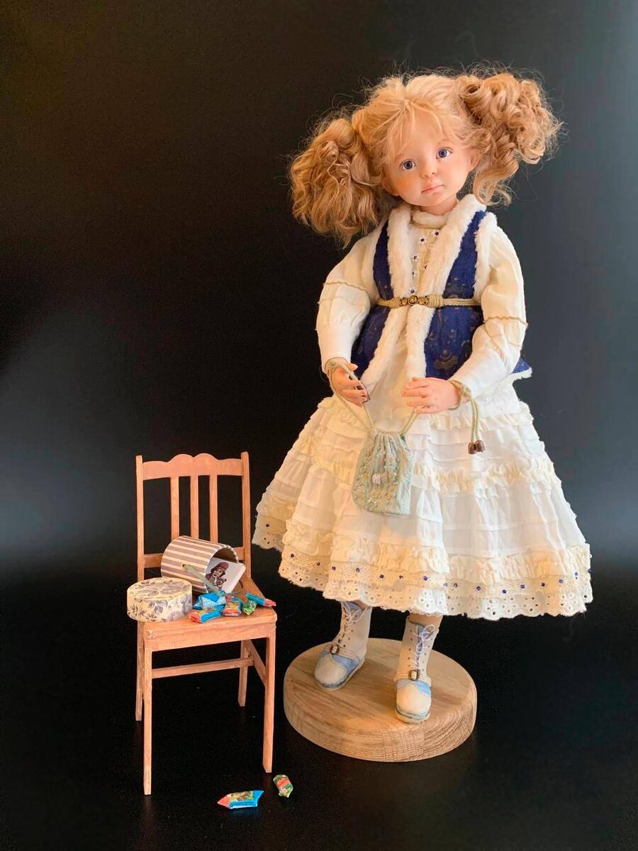 💙 Рост 33 см. Материалы: полимерная глина, хлопок, натуральная кожа, мех норки, стеклянные гранулы, древесные опилки, деревянные бусины, волосы ангорской козы. Одежда и обувь снимаются. Волосы можно расчесывать и заплетать. Голова, руки и ноги подвижные. Стоит при помощи подставки. Подставка в комплекте. Подарочная коробка. Пусть куколка принесет вам радость! 🫐🐳 50т. +доставка 🌸💕
