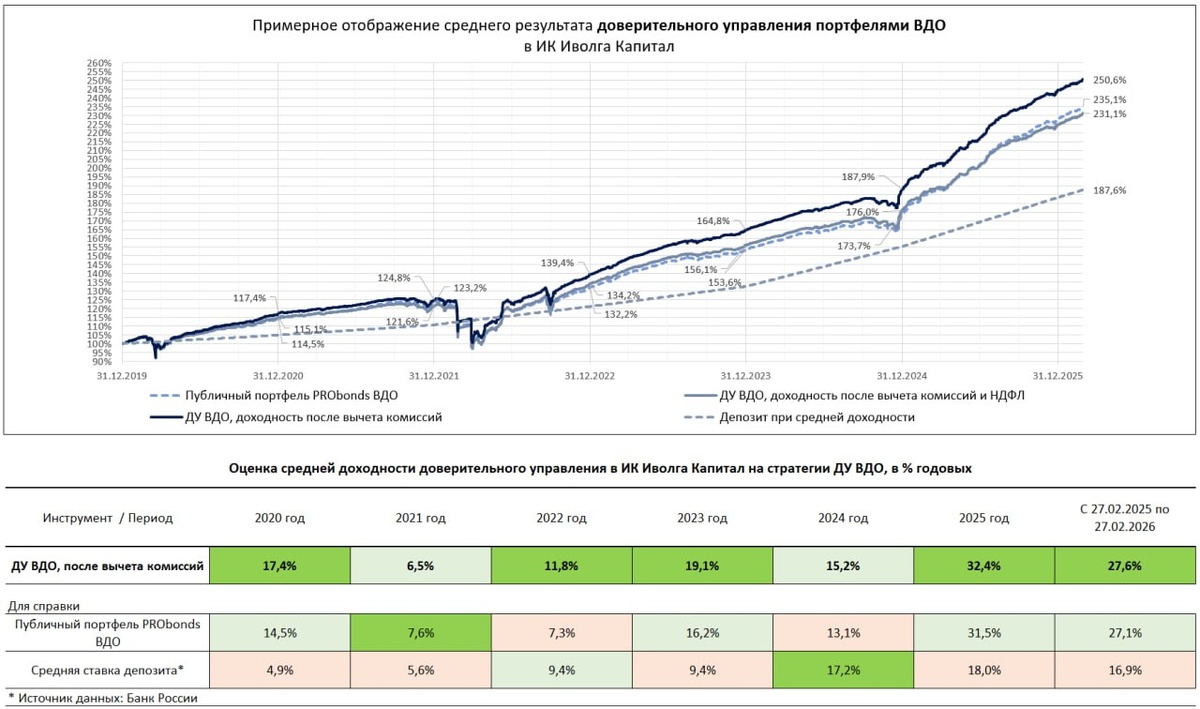 0️⃣ Предпосылки и предположения (предыдущий пост – здесь) • Средняя полученная доходность всех портфелей доверительного управления в ИК Иволга Капитал – 17,7-23,8% годовых после вычета комиссий, до удержания НДФЛ, в зависимости от стратегии. Это за всё время ведения ДУ. За последние 12 мес на нашей центральной стратегии – ВДО для квал.инвесторов – доходность до НДФЛ в среднем около 27,6% годовых. Сумма активов доверительного управления на начало марта увеличилась до 1,74 млрд р. (месяц назад 1,69).